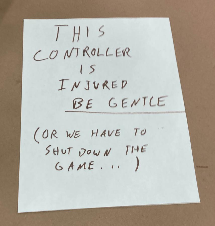 The first day of the festival was off to a pretty smooth start – both StarLords and the giant birthday cake were working correctly, with Ed explaining the game in his best "circus impresario" voice to throngs [2] of gathered attendees. I was mostly enjoying the show, when I happened back upstairs to find the area quiet and the game turned off. One of the controllers' clear acrylic plates had cracked, making the button no longer pressable and preventing the game from starting (since all four players had to click their buttons to start the game). Sam ginned up a quick fix with duct tape and added a sign to discourage further abuse.